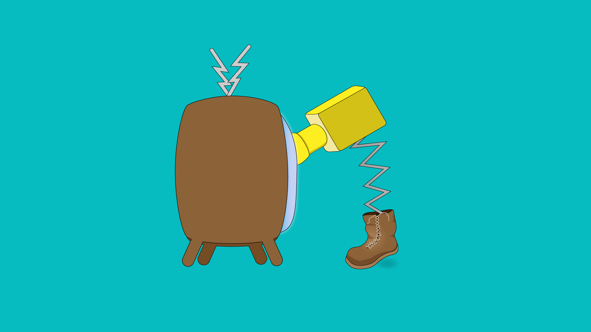 The TV rotated to a side profile, and then this cartoony video-camera, on a metal folding frame, and with a goofy looking shoe was there. It felt like the camera was delivering the video feed to the aliens, wherever in space they were; sure the camera looked goofy, but it seemed powerful in the distances it could transmit. It could have even been the case that the camera was here, while the aliens were watching from afar. The metal frame extended from the boot, just a bit to push the camera directly on the glass of the screen for a front-row view of the planet.