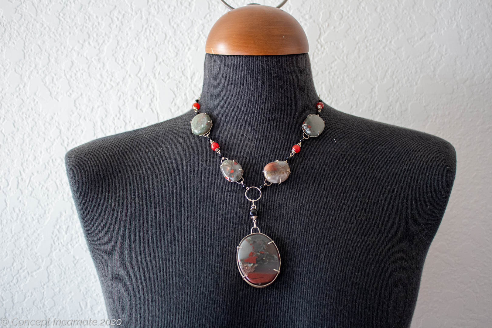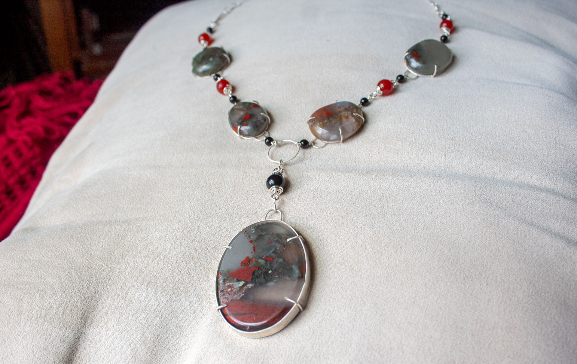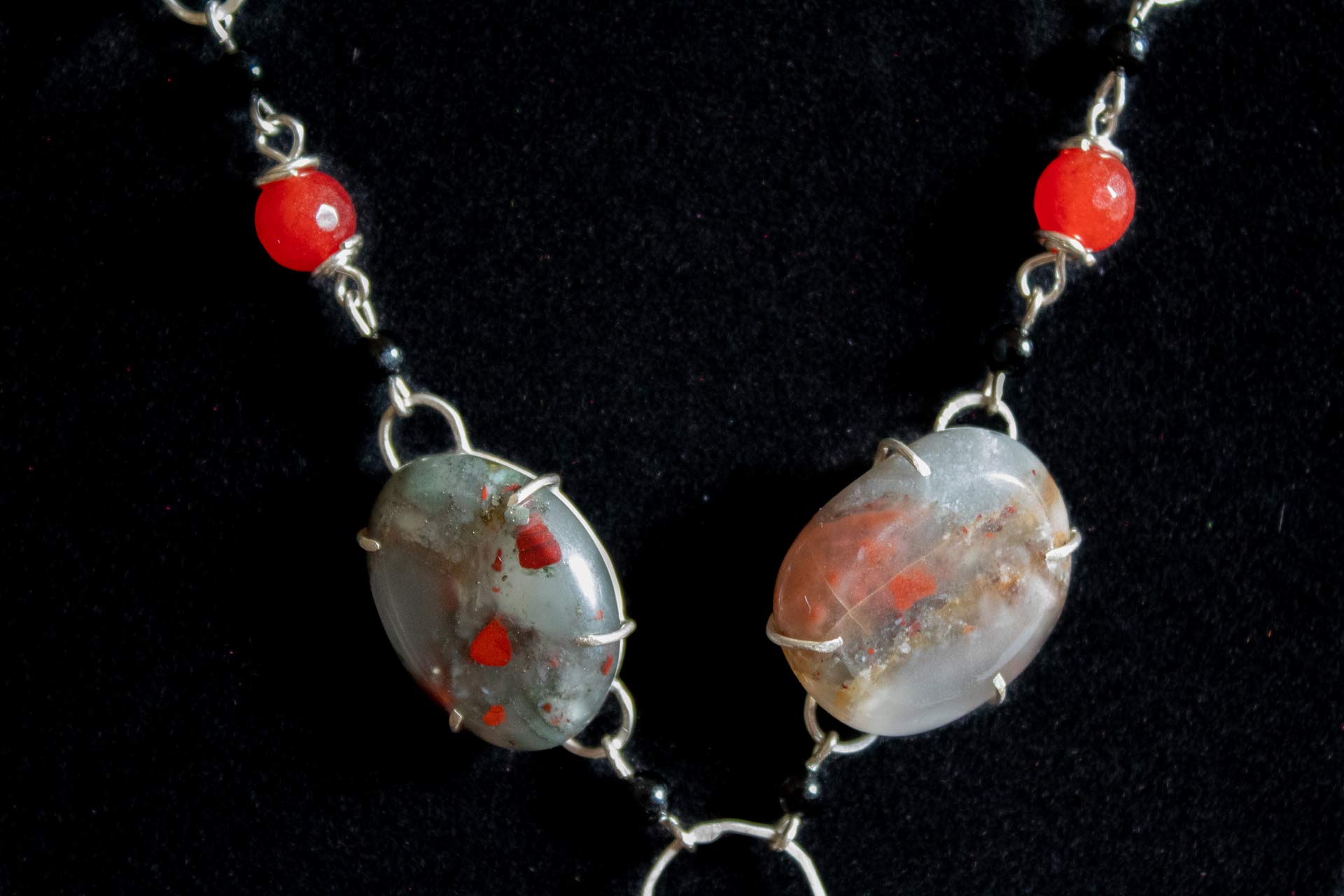 Feel the power from this necklace. Bloodstones, onyx and red jade help to bring the feeling of power, sex appeal, and courage for any battle (even a battle against your work computer that tests your patience). The bloodstones are soldered into place, while the beads are wire wrapped. A gravity-fed hook clasp makes putting this necklace on easy.