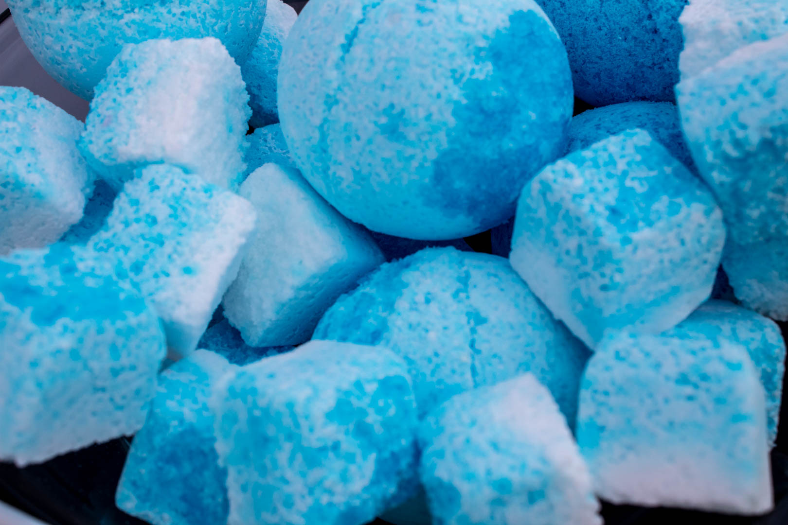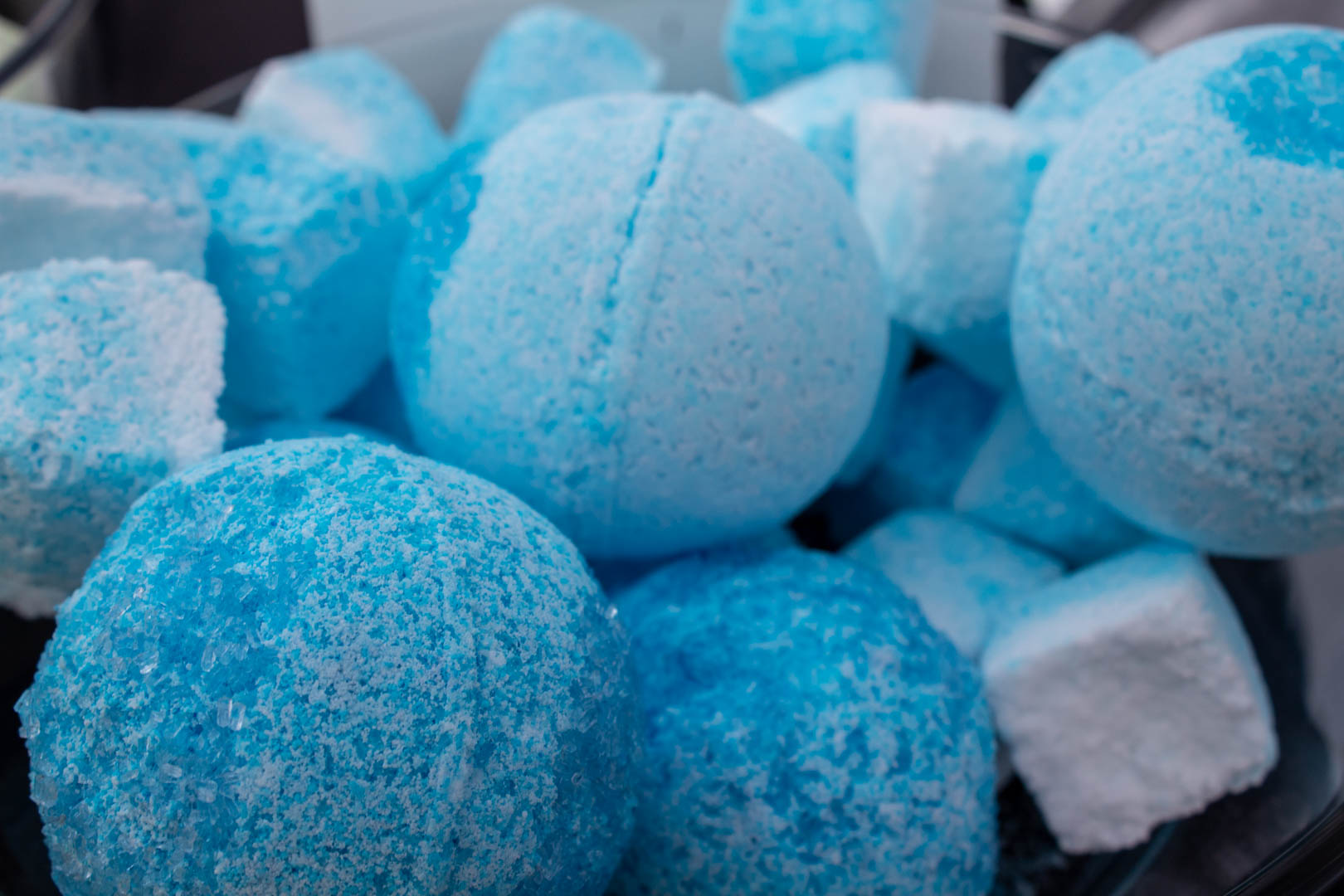 | Ingredients | Baking Soda, Citric Acid, Cream of Tartar (not in all batches), Epsom Salt, FDA Approved Edible Colouring, Organic Coconut Oil, Vegan Essential Oil, Witch Hazel Extract |