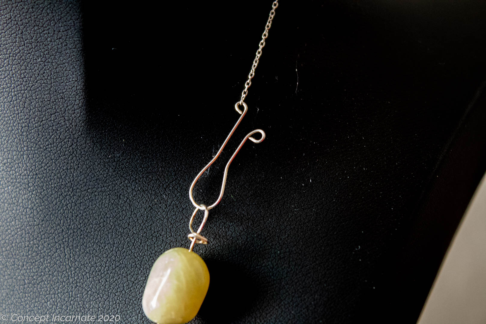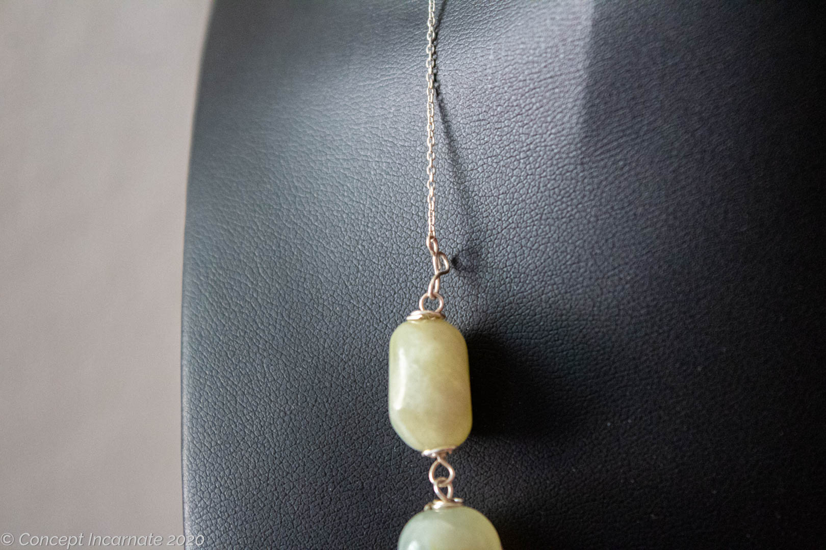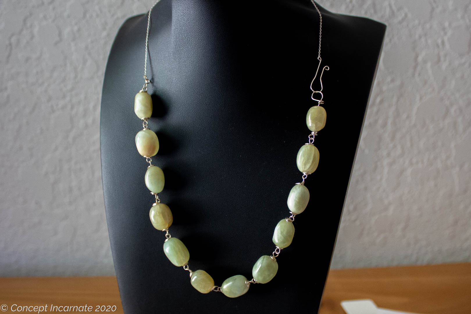 Large jade beads, roughly 18mm long, are wrapped with a 24 gauge thin silver wire. The strand of beads is attached to a silver chain. The necklace has a gravity secured hook clasp, so you don’t have to mess up your nailed with a typical lobster clasp.