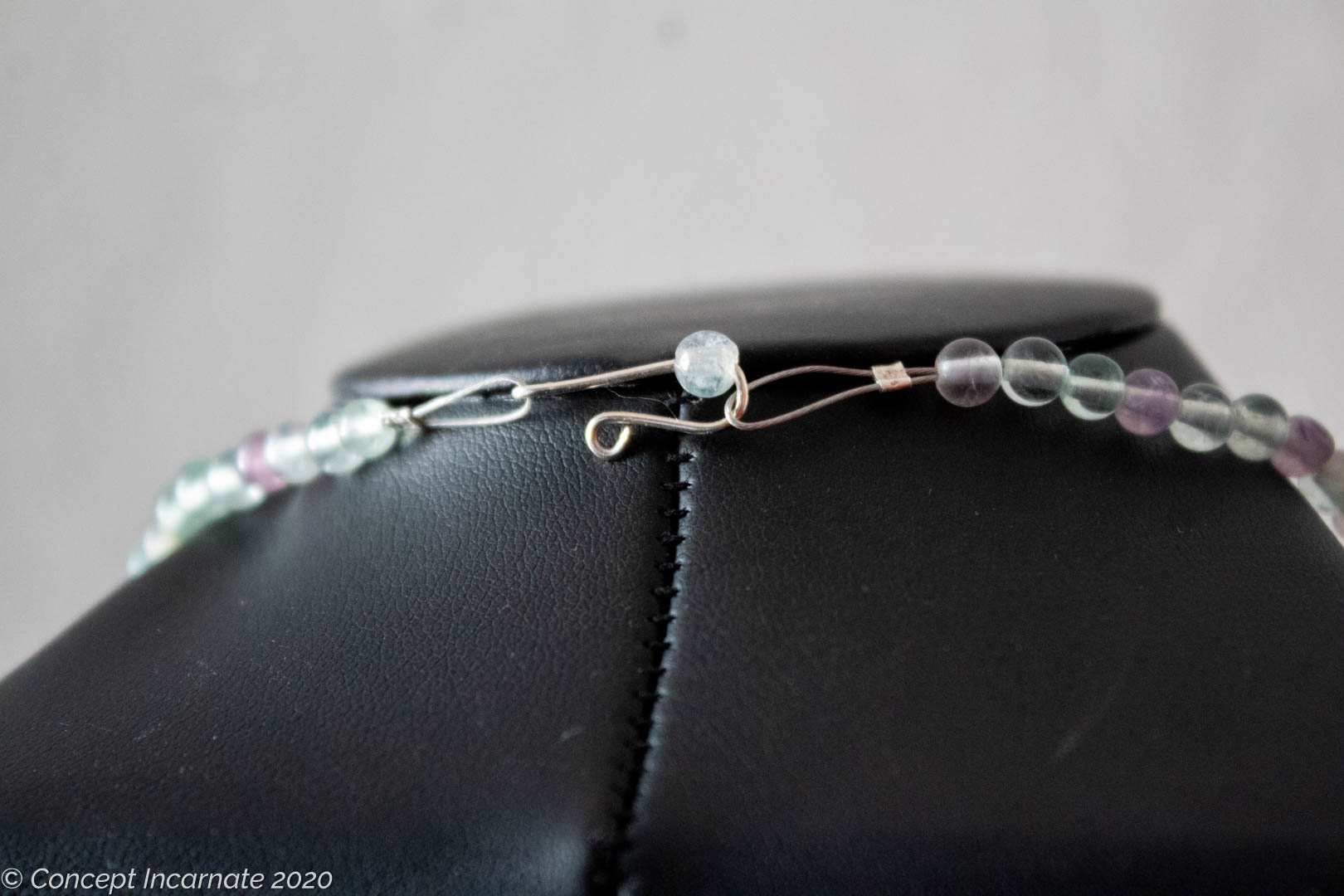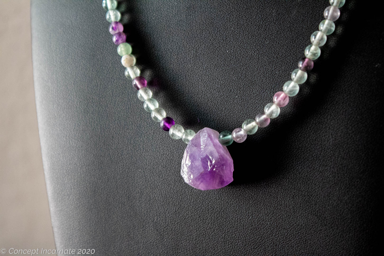 4mm Fluorite beads run edge to edge of this necklace which is set on beading wire. At the center of the necklace is a roughly cut Amethyst pendant. The necklace is secured with sterling silver shaped into a hook clasp.