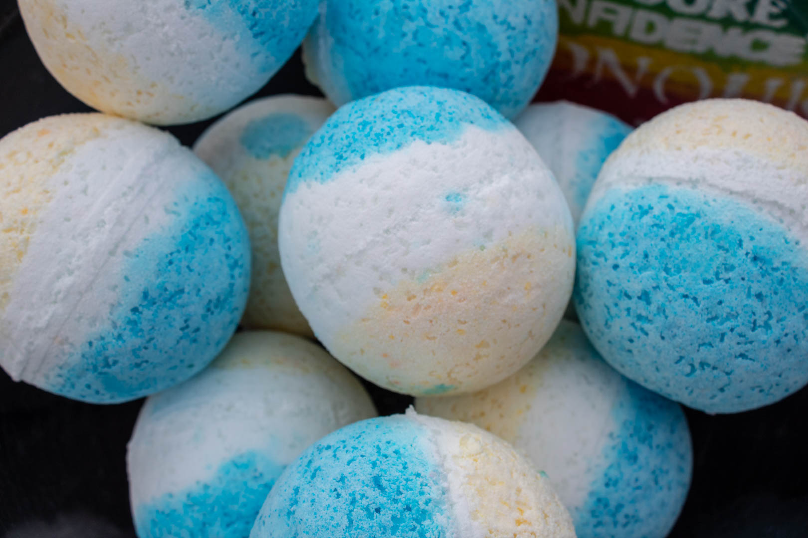 | Ingredients | Baking Soda, Citric Acid, Cream of Tartar (not in all batches), Epsom Salt, FDA Approved Edible Colouring, Organic Coconut Oil, Vegan Essential Oil, Witch Hazel Extract |